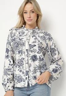 Biało-Granatowa Koszula z Wiskozy z Bufiastymi Rękawami w Kwiatowy Wzór Melhanor