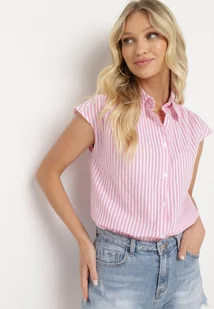Różowa Bawełniana Koszula Bez Rękawów w Paski Zapinana na Guziki Loratia