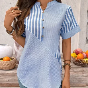 TEMU Bluzka w paski z krótkim rękawem i rozcięciem na szyi, w stylu patchwork