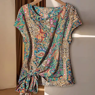 TEMU Bluzka bez rękawów dla kobiet z żywym kwiatowym nadrukiem i wiązanym dołu na pasie - Okrągły dekolt, krótkie bufiaste rękawy, lekki poliester na
