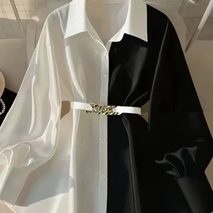 TEMU Bluzka Damska Elegancka Retro z Kolorowymi Blokami, Regulowanym Paskiem i Złotymi Guzikami - Luźny Krój z Długim Rękawem w Biało-Czarnym,
