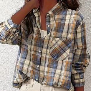 TEMU BK052821 Damska Koszula w Kratę z Długim Rękawem, Czysty, Styl Vintage, Casual i Elegancka