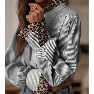 TEMU Bluzka Damska Elegancka w Paski i Wzór – Luźny Fason, Okrągły Dekolt, Uniwersalna na Każdą Porę Roku, Koszulki i Bluzki dla Kobiet, Stylowa