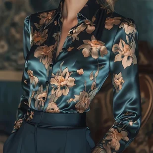 TEMU Bluzka Damska Elegancka z Kwiatowym Wzorem - Koszula z Długim Rękawem i Guzikami w Kolorze Turkusowo-Złotym, Nieprześwitująca do Biura i na