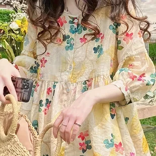 TEMU Bluzka Damska w Kwiaty - Nieprześwitująca Koszulka z Okrągłym Dekoltem, Turkusowo-Żółty Wzór Kwiatowy, Lekki Materiał Bez Elastyczności na