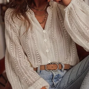 TEMU Damska Casualowa Koszulka z Dekoltem w Serek, Przezroczysta, Seksowna, Długi Rękaw, Koronkowa z Wycięciami
