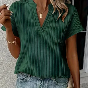 TEMU Bluzka Damska z Dekoltem w Serek i Krótkim Rękawem - Miękki, Teksturowany Top o Luźnym Kroju, Możliwość Prania w Pralce, Jednokolorowa na