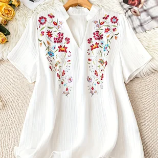 TEMU Bluzka Damska z Dekoltem w Serek - Nieprzezroczysta Koszulka Biała z Wzorem Kwiatowym Czerwono/Niebiesko/Różowo/Pomarańczowo/Turkusowa, Lekka i