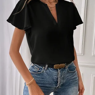 TEMU Bluzka Damska z Eleganckim Dekoltem w Serek i Falbankami na Rękawach - Lekki 100% Poliestrowy Krótki Top, Pralna Maszynowo Jednokolorowa Koszula