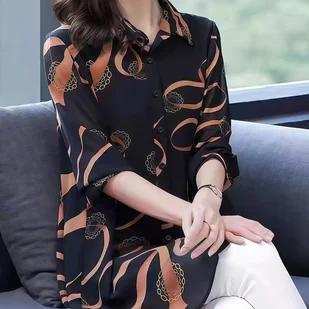 TEMU Bluzka Damska z Eleganckim Geometrycznym Wzorem - Lekka, Półprześwitująca Koszula z Długim Rękawem w Czarno-Pomarańczowe Wzory, Kołnierzyk na