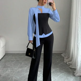 TEMU Bluzka Damska z Eleganckim Kolorowym Bem i Stójką - Długi Rękaw, Koszula na Guziki w Jasnoniebieskim i Czarnym, Wszechstronna Bluzka na
