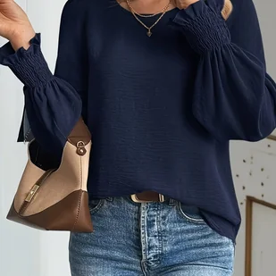TEMU Bluzka Damska z Eleganckim Okrągłym Dekoltem i Marszczeniami na Długich Rękawach - Jednokolorowa, Możliwość Prania w Pralce, Wszechsezonowy Top