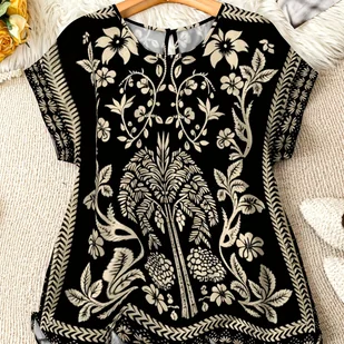 TEMU Bluzka Damska z Eleganckim Rękawem Batwing - Czarno-Beżowa, Retro Kwiatowy Print, Okrągły Dekolt, Wszechstronna na Każdą Porę Roku, Do Biura,