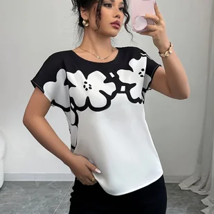 TEMU Bluzka Damska z Eleganckim Wzorem Kwiatowym - Czarno-Biała, Krótki Rękaw, Lekki Materiał na Wiosnę/, Idealna do Codziennego Noszenia lub Biura,