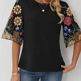TEMU Bluzka Damska z Krótkim Rękawem i Okrągłym Dekoltem, Wyszywana Kolorowymi Kwiatami & Przezroczyste Siateczkowe Rękawy - Oddychająca na Wiosnę/,