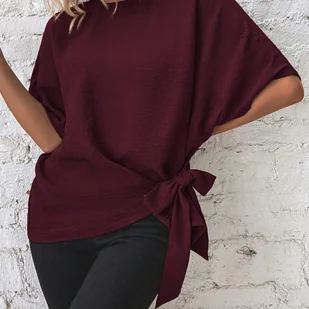 TEMU Bluzka Damska z Rękawami Batwing w Kolorze Bordowym, Detal Bocznego Wiązania - Okrągły Dekolt, Jednokolorowa, Regularny Krój na Wiosnę Jesień,