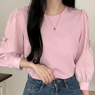 TEMU Bluzka damskie z okrągłym dekoltem i detalami w szpic, 100% poliestrowy materiał z dzianiny, jednokolorowa, rękawy trzy czwarte długości,