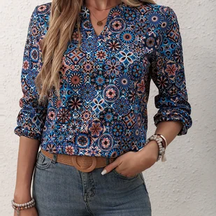 TEMU Elegancka damska bluzka z długim rękawem, pełnym kwiatowym nadrukiem i ażurowym kołnierzykiem na wiosnę i jesień
