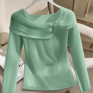 TEMU Bożonarodzeniowa LYYVE Elegancka Tunika Damska w Kolorze Miętowej Zieleni z Falbanką na Kołnierzu - Dopasowana Bluzka z Długim Rękawem i Krótką