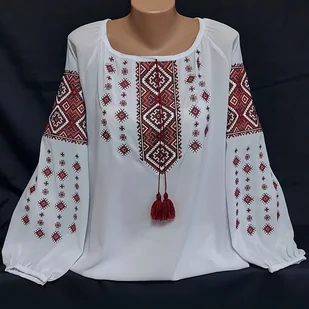 TEMU Damska Biało-Czerwona Bluzka z Inspirowanym Nadrukiem – Długi Rękaw, Ukraińsko-Słowacka Koszula ze Frędzlami i Wiązany Kołnierzykowy Zapięcie,