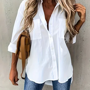 TEMU Damska bluzka na guziki z długim rękawem - jednokolorowa, zrelaksowana, z długim rękawem i kieszenią na klatce piersiowej, wszechstronna bluzka
