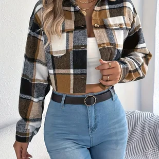 TEMU Damska brązowa koszula w kratę z krótkim rękawem - codzienna bluzka zapinana na guziki z kołnierzykiem z klapami, długi rękaw, na każdą porę