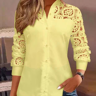 TEMU Bluzka Damska Elegancka z Kontrastową Koronką i Haftem - Długi Rękaw, Jednokolorowa Koszula z Klasycznym Kołnierzykiem, Pranie w Pralce,