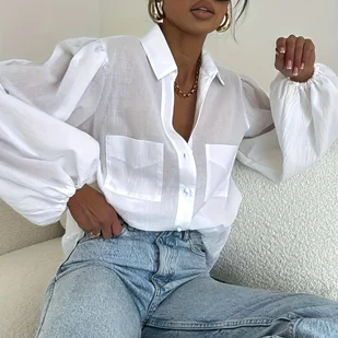 TEMU Damska Elegancka Koszula z Długim Rękawem z Szyfonu z Guzikami z Tkaniny, Podwójna Kieszeń z Przodu, Jednokolorowa, Nieelastyczna,
