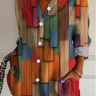 TEMU Damska koszula casualowa z geometrycznym nadrukiem, długim rękawem i guzikami - kolorowy i pełny życia design, kołnierz, lekka i oddychająca na