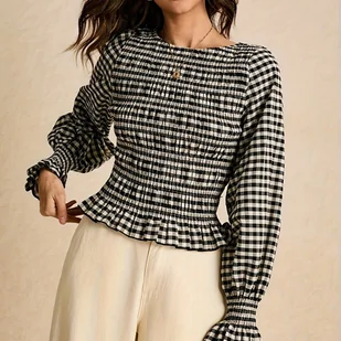 TEMU Damska koszula z długim rękawem o dopasowanym kroju, z czarno-białymi plisami w szachownicę i falbankami, idealna na jesień i zimę.