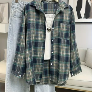 TEMU Damska kurtka koszula w kratę | Luźny krój, leniwy styl, koreańska uniwersalna bluzka casual, do warstwowania jesienią/zimą, mały amerykański
