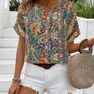 TEMU Damska letnia bluzka z dekoltem w kształcie litery V, odkryte ramiona, luźny kształt, nadruk boho - kolorowy wzór geometryczny, krótkie rękawy,