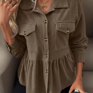 TEMU Damski Kardigan z Kołnierzykiem i Paskiem - Jednokolorowy Sztruks (Pasek Nie Dołączony)