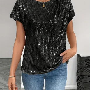 TEMU Damska Błyszcząca Bluzka z Cekinami – Krótki Rękaw, Okrągły Dekolt, Jednokolorowa Koszula Idealna na Wiosnę, , Jesień, Przyjęcia, Śluby, Styl