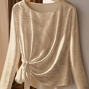 TEMU Damski Złoty Foliowy Materiał Okrągły Dekolt Długi Rękaw Wiązana Casual Koszula