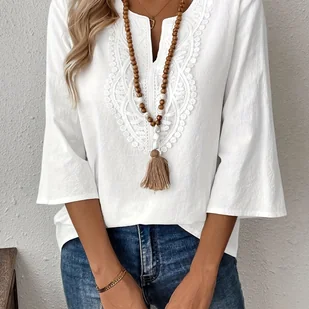 TEMU Elegancka biała bluzka damską z detalami falbankowymi - stylowa dekolta w kształcie klucza, długi rękaw, jednokolorowa koszula na każdą porę