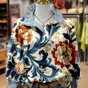 TEMU Elegancka Bluzka Damska w Paisley - Długi Rękaw, Zapinana na Guziki, Wielokolorowa (Granatowy/Beżowy/Czerwony/Złoty) - Strukturalna Zimowa