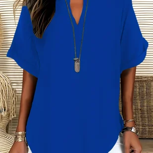 TEMU Elegancka bluzka damska z dekoltem w kształcie litery V i opadającymi ramionami - jednokolorowa, casualowa bluzka letnia na weekend, luźny krój,