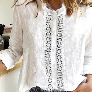 TEMU Elegancka Damska Koszula z Długim Rękawem w Jednolitym Kolorze z Koronkowymi Wstawkami, z Kołnierzem z Falbanką i Luźna Biała Koszula na Guziki