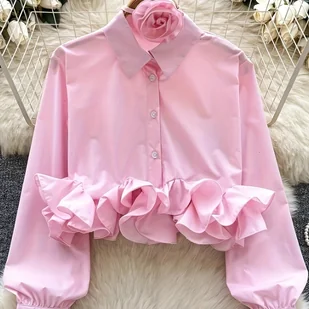 TEMU Elegancka Bluzka Damska z Krótkim Rękawem - Długi rąbek, Kołnierzyk i Mankiety w Falbankach, Jednokolorowa Koszula na Śluby, Przyjęcia & Biuro –
