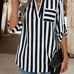 TEMU Elegancka bluzka w paski z dekoltem w szpic i kieszeniami - Swobodny, stylowy top z długim rękawem dla kobiet, czarno-białe paski w pionie,