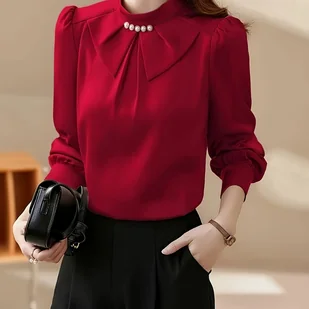 TEMU Elegancka czerwona bluzka damską z długim rękawem i detalami perłowymi - stójka, koszula zapinana na guziki na wiosnę/leto/jesień, idealna do
