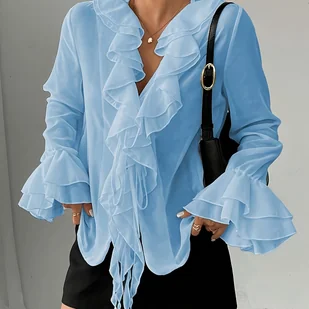 TEMU Elegancka, damska bluzka z wycięciem w kształcie litery V, z falbanikiem, długim rękawem i zapinaną z przodu - swobodnie pasująca, jednokolorowa