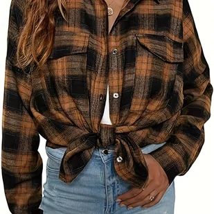 TEMU Elegancka damska koszula w kratę - Czerwona bluzka zapinana na guziki w kratę z kieszeniami, tunika z długim rękawem na wiosnę/jesień, do biura,