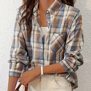 TEMU Elegancka damska koszula w kratę - klasyczna beżowo-brązowa koszula zapinana na guziki, można prać w pralce, odpowiednia na każdą porę roku,