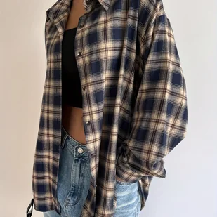 TEMU Elegancka damska koszula w kratę z kołnierzykiem - bluzka zapinana na guziki z długim rękawem i kieszenią na piersi, luźny krój, wzór tartan w