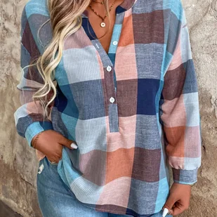 TEMU Elegancka Kobieca Koszula w Kratę - Wielokolorowa Bluzka w Kratę (Różowa/Niebieska/Beżowa/Turkusowa) | Krótki Rękaw z Kołnierzykiem na Guziki,
