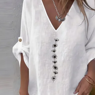 TEMU Elegancka Koszula Damska - Jednokolorowy Dekolt w Serek, Casualowa Modna Bluzka z Nadrukiem "Czarne Małe Kwiaty", Detal Guzyków Luźny Krój na