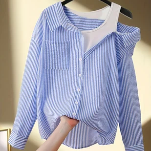 TEMU Elegancka Koszula Damska w Paski Niebiesko-Białe z Kołnierzykiem i Guzikami - Bluzka z Krótkim/Długim Rękawem, Do Biura, Nauczania, Codziennego