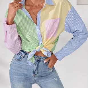 TEMU Elegancka Koszula w Paski z Kolorowymi Blokami, Kołnierz z Lapelami, Długi Rękaw, 100% Poliester Tkanina Tkany, Detale Guzików, Odzież Damska na